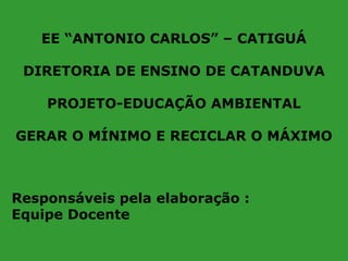 Este projeto de educação ambiental tem como objetivo conscientizar alunos e a comunidade sobre a importância da redução, reutilização e reciclagem de lixo através de atividades interdisciplinares como debates, pesquisas, confecção de cartazes e objetos com materiais recicláveis, e campanhas de coleta seletiva.