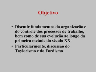 Este documento discute os fundamentos da organização e controle dos processos de trabalho no início do século XX, particularmente o taylorismo e o fordismo. Apresenta definições-chave como capital fixo, capital variável e composição orgânica do capital. Descreve os princípios do taylorismo como a racionalização do trabalho através do controle de tempos e movimentos. Explica como o fordismo intensificou esses princípios através da produção em massa e cadeia de montagem.