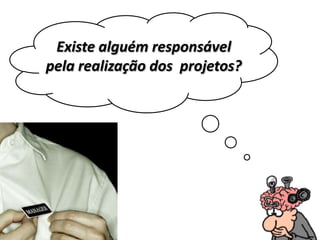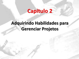 O documento discute habilidades para gerenciar projetos, como escolher líderes e equipes qualificados e engajados no projeto, e a importância da comunicação clara. Também aborda perfis de gerentes de projetos, canais de comunicação, técnicas de escuta e reuniões.