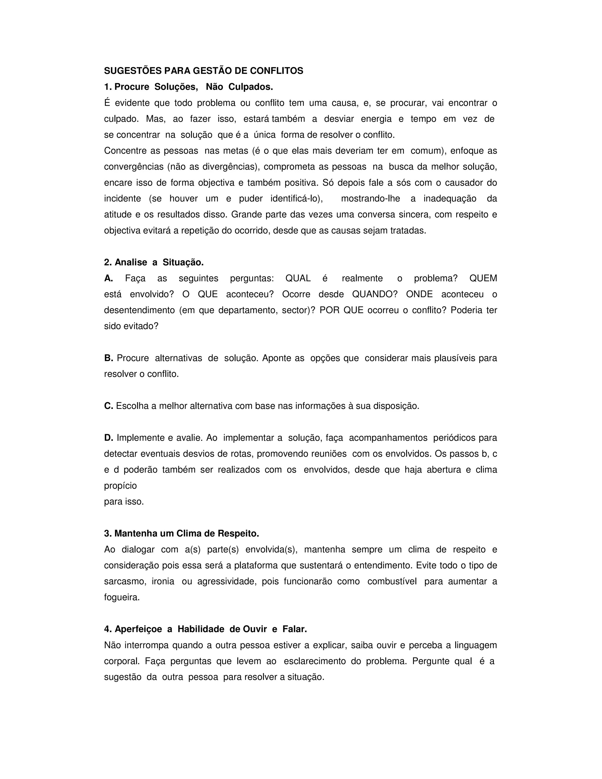 Este documento fornece 10 sugestões para gestão de conflitos, incluindo: 1) focar nas soluções em vez de culpados, 2) analisar a situação cuidadosamente, e 3) buscar soluções que beneficiem ambas as partes ("win-win").