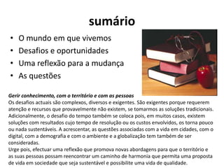 O documento discute os desafios da sociedade digital atual, incluindo a globalização, a sociedade da informação e o uso crescente de tecnologias digitais. Também aborda como as redes digitais estão transformando as relações humanas e a disseminação do conhecimento. Defende que precisamos de novas abordagens para gerir conhecimento, território e pessoas de forma sustentável nesta era digital.