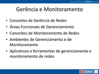 O documento aborda conceitos de gerenciamento e monitoramento de redes, enfatizando a necessidade de ferramentas automatizadas à medida que a complexidade das redes aumenta. Apresenta as áreas funcionais de gerenciamento, como gerenciamento de falhas, configuração, registros, desempenho e segurança, além de citar protocolos como SNMP e CMIP. Também menciona diversas ferramentas de monitoramento, como Nagios, Zabbix, e Cacti, que são utilizadas na análise e gerenciamento de redes.