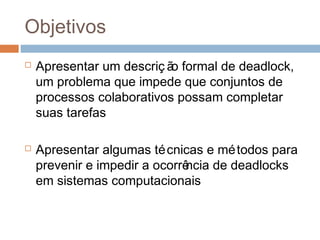 1) O documento discute o problema de deadlocks em sistemas operacionais, onde conjuntos de processos bloqueados aguardam recursos mantidos uns pelos outros.