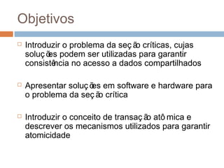 O documento apresenta conceitos fundamentais da sincronização em sistemas operacionais, abordando o problema da seção crítica e as soluções para garantir a consistência no acesso a dados compartilhados. Discorre sobre estratégias como a solução de Peterson, hardware de sincronização, semáforos e monitores, além de discutir problemas clássicos de sincronização, como o buffer limitado e o jantar dos filósofos. O foco é na exclusão mútua, progresso e espera limitada nas operações de controle de concorrência entre processos.
