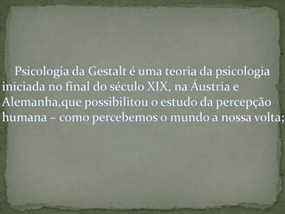 O documento apresenta os princípios fundamentais da teoria da Gestalt, desenvolvida na Alemanha no início do século XX. A Gestalt defende que a percepção humana envolve ver o todo, não apenas partes isoladas, e que o todo é sempre maior que a soma das partes. Alguns princípios perceptivos fundamentais da Gestalt incluem proximidade, continuidade, semelhança, segregação e simplicidade. A teoria influenciou a pedagogia, defendendo que os objetivos educacionais devem ser claros para facilitar a compreensão