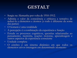 A Teoria da Gestalt surgiu na Alemanha no início do século XX e criticava a abordagem elementarista, defendendo que o todo é maior que a soma das partes. Estudava os processos cognitivos como percepção, memória e aprendizagem. Seus principais representantes foram Wertheimer, Koffka e Köhler, que realizaram experimentos pioneiros sobre percepção e aprendizagem por insight em animais. Após a ascensão do nazismo, muitos gestaltistas tiveram que deixar a Alemanha.