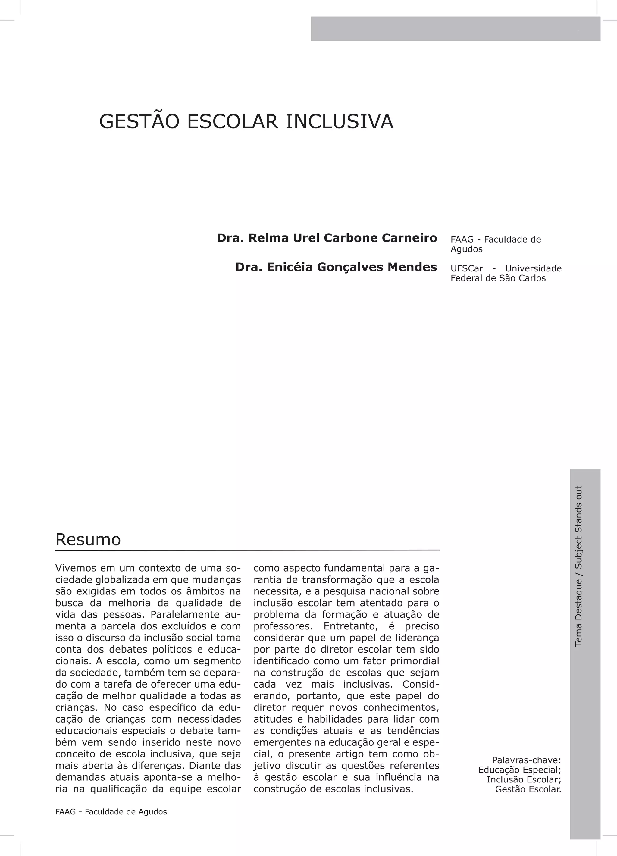 Este documento discute a gestão escolar inclusiva e sua influência na construção de escolas mais abertas às diferenças. Aborda o contexto da educação inclusiva no Brasil e no mundo, a transição do modelo de integração para o de inclusão, a legislação brasileira sobre o tema, a importância da formação de recursos humanos e do papel do diretor escolar nesse processo.