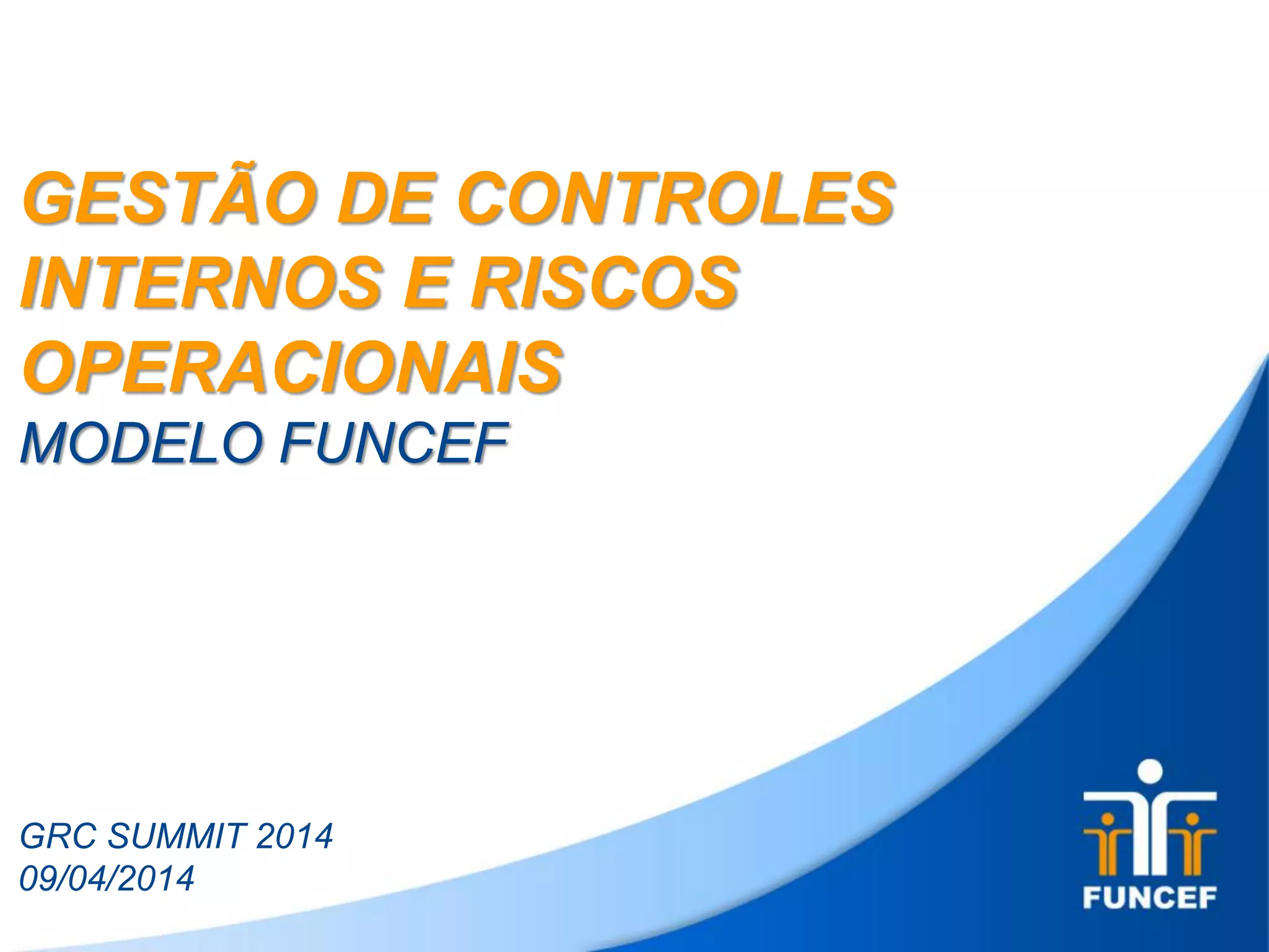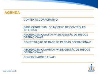 O documento apresenta o modelo de gestão de riscos operacionais e controles internos da FUNCEF, descrevendo: 1) o mapeamento de riscos nos processos, 2) a autoavaliação qualitativa dos riscos e controles, e 3) o ciclo de mapeamento e gestão contínua de riscos.
