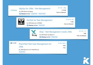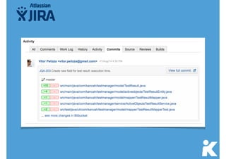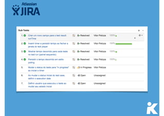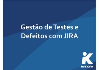 Este documento discute a gestão de testes e defeitos no JIRA. Ele fornece uma visão geral do processo de teste estruturado TMAP e dos padrões IEEE 829, além de discutir como ferramentas como JIRA, Bugzilla e Pivotal Tracker podem ser usadas na prática para gerenciar defeitos e testes. Também apresenta brevemente o roadmap da ferramenta Kanoah para gestão de testes.