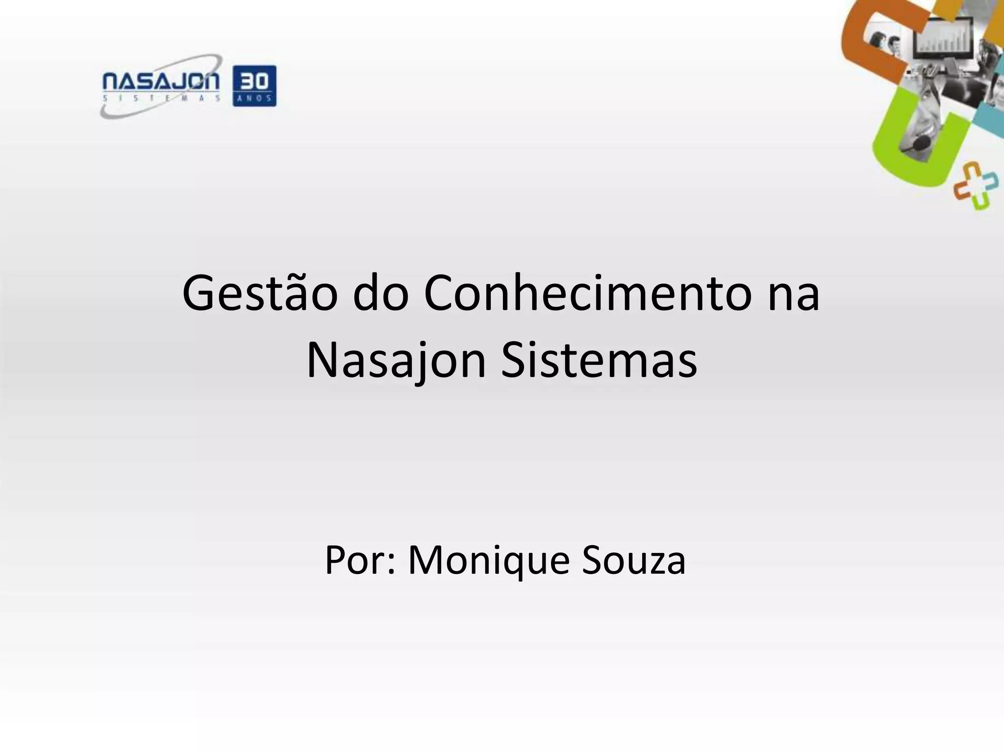 O documento discute a implementação da Gestão do Conhecimento na empresa Nasajon para incentivar os funcionários a compartilharem seus conhecimentos explícitos e tácitos, melhorar a produtividade da empresa, e reter o conhecimento dos funcionários. A Gestão do Conhecimento visa a transferência do conhecimento entre os funcionários para que o conhecimento possa ser aplicado em novas situações e gerar resultados cada vez melhores.