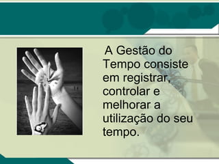O documento discute estratégias para melhor gerenciamento do tempo, incluindo identificar atividades importantes versus urgentes, planejamento diário com priorização de tarefas, definição de objetivos de curto e longo prazo, e delegação e eliminação de tarefas desnecessárias.