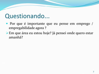 O documento discute a importância do planejamento de carreira no contexto das mudanças nas relações entre empresas e profissionais. A empregabilidade passou a depender mais dos esforços individuais de cada um para se manter relevante, enquanto as empresas oferecem contratos de curto prazo. É essencial pensar cedo na área de atuação, desenvolver habilidades e manter uma rede de contatos.