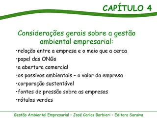 O documento discute vários tópicos relacionados à gestão ambiental empresarial, incluindo: 1) as três forças que influenciam as preocupações ambientais dos empresários - governo, sociedade e mercado; 2) os modelos de gestão ambiental como Produção Mais Limpa, Ecoeficiência e outros; 3) os instrumentos que as empresas podem usar para alcançar objetivos ambientais como auditoria ambiental e relatórios ambientais.