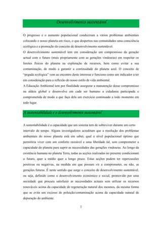 O documento discute a importância do desenvolvimento sustentável e da educação ambiental para preservar o planeta. Aborda conceitos como pegada ecológica e poluição atmosférica, e sistemas de gestão ambiental como o EMAS. Defende que pequenas ações individuais, como reduzir resíduos e consumos, e a separação de lixo para reciclagem, podem ter grande impacto coletivo na preservação dos recursos naturais.