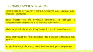 O documento discute a gestão ambiental no cenário atual de crescimento da devastação ambiental e desigualdade social. Apresenta os conceitos de meio ambiente, sistema ambiental, conservação, preservação e desenvolvimento sustentável. Explora os modelos de gestão ambiental pública e privada e práticas como controle de poluição, prevenção da poluição e estratégias.