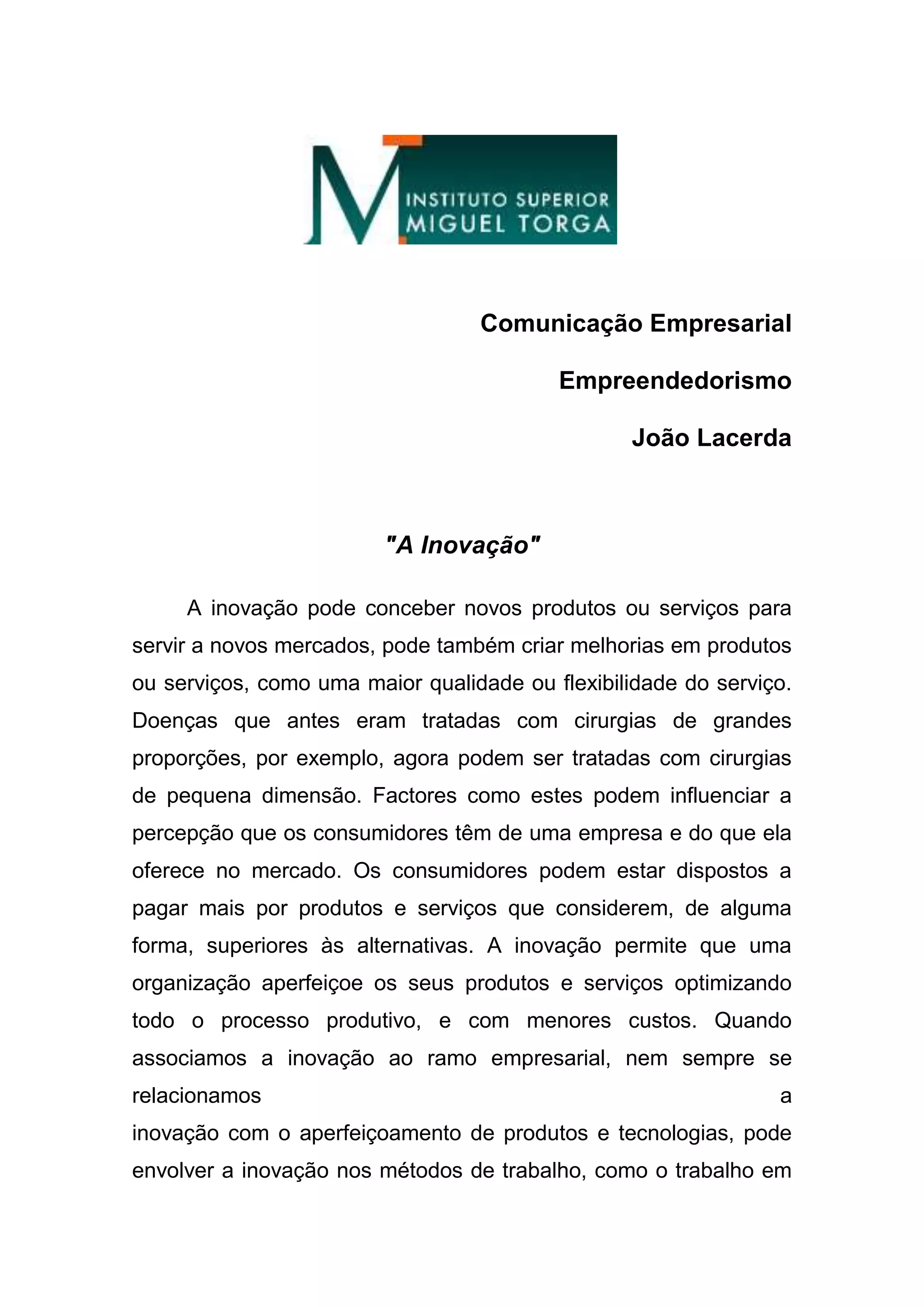 Este documento discute a importância da inovação para as empresas. A inovação pode melhorar produtos e serviços, reduzir custos e fornecer vantagens competitivas sustentáveis no mercado. No entanto, o sucesso da inovação não é garantido, portanto, as empresas precisam entender bem os processos de gestão da inovação para se manterem bem-sucedidas a longo prazo.