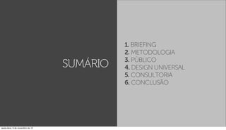 O documento discute a escassez de produtos eletrodomésticos adaptados para pessoas com limitações físicas, especialmente deficientes visuais e idosos. Através de uma parceria entre o grupo Mabe e o Instituto Europeu de Design, foram realizadas pesquisas e entrevistas para entender as necessidades desse público, além de propor soluções inclusivas baseadas no design universal. O objetivo é criar produtos acessíveis que garantam usabilidade e independência a consumidores com diferentes habilidades, enquanto promove um compromisso social da empresa com a inclusividade.