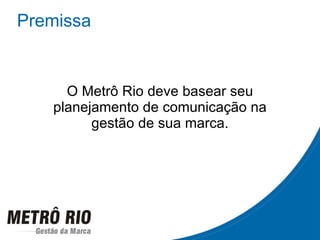 O documento propõe que o metrô do Rio de Janeiro deve atualizar sua logomarca para refletir uma comunicação moderna e dinâmica, utilizando formas circulares reconhecíveis. A nova identidade da marca incluirá um slogan e associará o metrô a valores como esporte, cultura, cidadania e ecologia, visando criar uma imagem positiva e contemporânea. Além disso, sugere uniformizar ações sociais sob uma marca guarda-chuva, fortalecendo o engajamento com o público jovem.