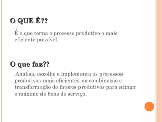 O documento discute os principais conceitos e técnicas de gestão da produção, incluindo Just in Time, Lean Manufacturing, 5S, FMEA, Kanban, Kaizen, PCP e ERP. O objetivo da gestão da produção é tornar o processo produtivo o mais eficiente possível através da análise e implementação dos métodos de produção mais eficientes.