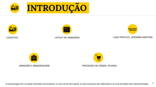 O documento discute a gestão de armazéns, incluindo tópicos como logística, armazenamento, layout de armazéns, processos de picking e um caso prático da Jerónimo Martins. Aborda conceitos como receção, arrumação, tipos de armazéns e sistemas para melhorar a produtividade no armazenamento e picking de pedidos.