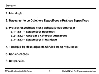 Gestão de Configuração é uma disciplina que aplica supervisão, direção técnica e administrativa ao identificar e documentar as características funcionais e físicas de um item de configuração, controlar as mudanças dessas características, registrar e reportar a situação do processamento e implementação das mudanças, verificar a conformidade com os requisitos especificados. Estabelecendo e mantendo a integridade dos produtos de trabalho. As principais atribuições da área de GC são: identificação de configuração, controle de configuração, contabil