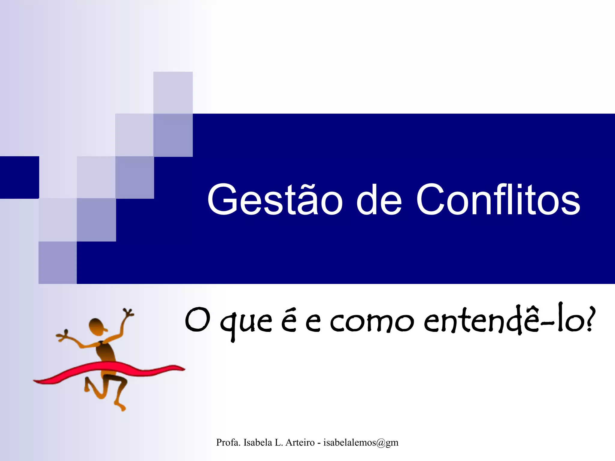 O documento discute a gestão de conflitos, definindo o que é conflito e apresentando duas perspectivas sobre o mesmo: uma negativa, que o vê como prejudicial, e uma positiva, que enfatiza os benefícios da discussão produtiva. Também descreve causas comuns de conflitos em organizações e estratégias para analisá-los e resolvê-los de forma construtiva.