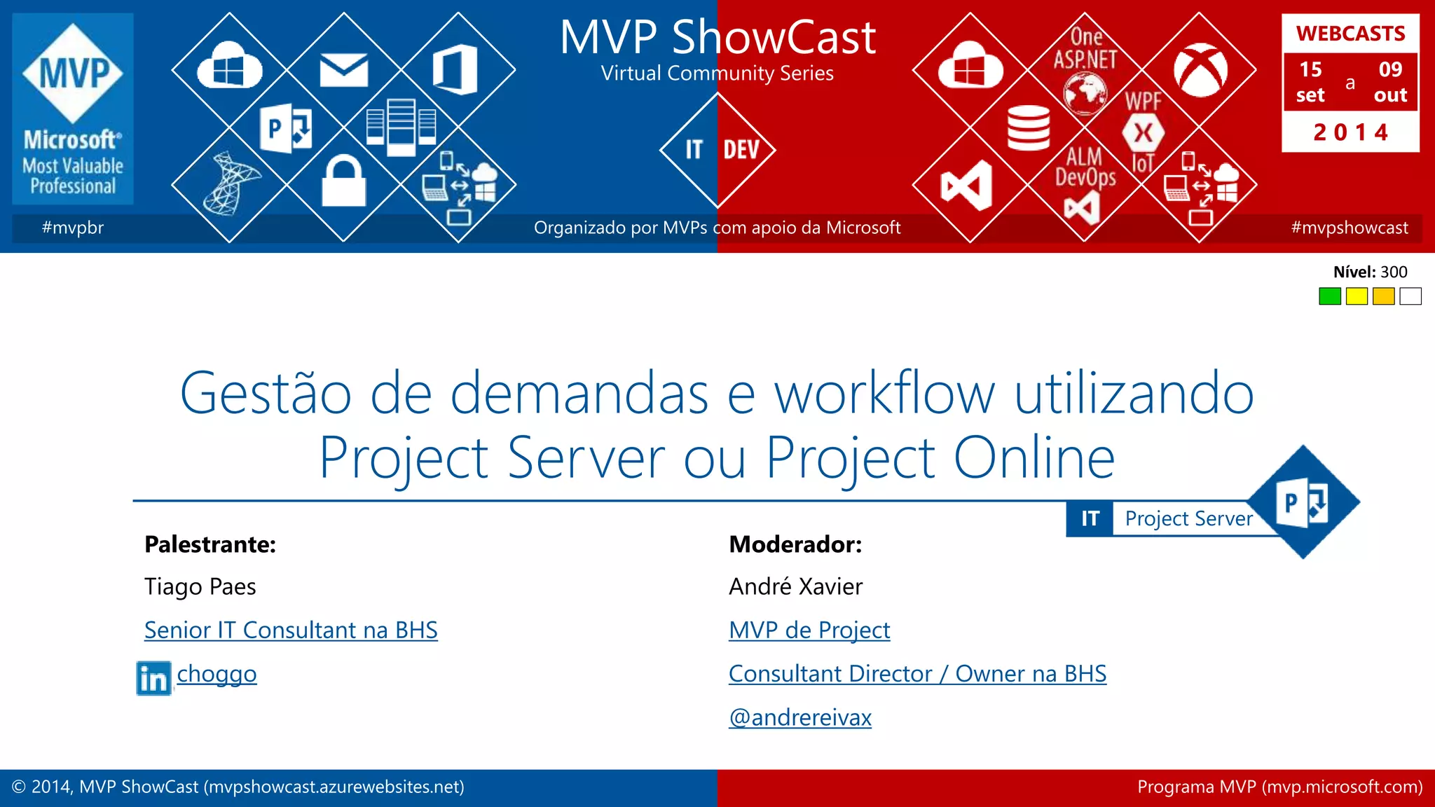 O documento resume um webcast sobre gestão de demandas e workflow utilizando Project Server ou Project Online. O webcast inclui apresentações sobre novidades em workflow no SharePoint 2013 e Project Server 2013, melhorias no workflow do SharePoint, infraestrutura e arquitetura de workflow, e uma demonstração de criação de workflows.