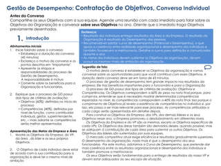 O documento descreve o processo de gestão de desempenho com o objetivo de: 1) garantir que todos na organização entendam seu papel nos resultados; 2) motivar os funcionários; e 3) fortalecer a meritocracia. O processo inclui a definição de objetivos individuais alinhados com as metas organizacionais e o desenvolvimento de competências esperadas para cada função.