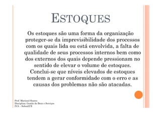 Os estoques são mantidos pelas organizações para protegê-las contra imprevisibilidades nos processos internos e externos. Níveis muito altos de estoques tendem a ocultar problemas e erros. As organizações devem determinar quais itens manter em estoque, quando realizar reabastecimentos e quanto estocar para atender às necessidades de forma otimizada.