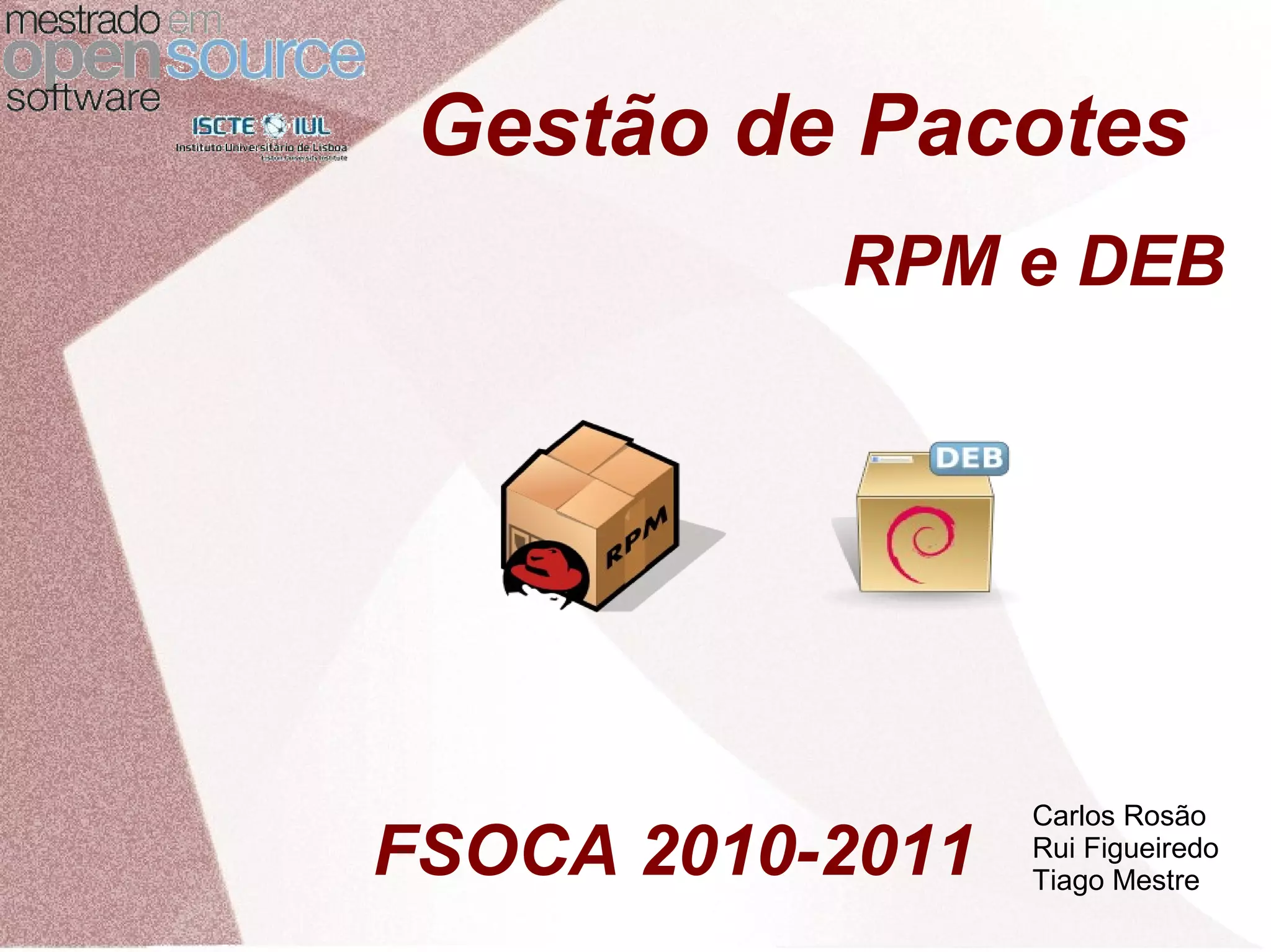 O documento aborda a gestão de pacotes RPM e DEB, explicando conceitos de pacotes, sua estrutura interna e a importância dos gestores de pacotes como dpkg e rpm. Destaca a automação de tarefas relacionadas à instalação, remoção e atualização de pacotes, além de mencionar ferramentas gráficas e discussões sobre o futuro da unificação de pacotes. O desenvolvimento de gestores de pacotes é considerado um marco na história do Linux, com significativas influências em diversas áreas.