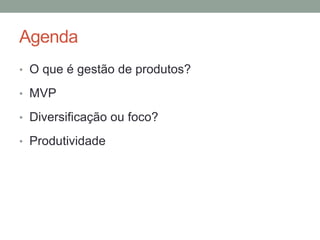 O documento apresenta uma visão abrangente sobre gestão de produtos de software, destacando sua importância na conexão entre estratégias empresariais e as necessidades dos clientes. Aborda conceitos como MVP, diversificação versus foco, e sugere práticas para aumentar a produtividade nas equipes de desenvolvimento. O autor enfatiza a necessidade de um portfólio diversificado de produtos para garantir o sucesso no mercado.