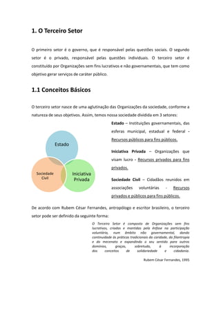 O documento discute o terceiro setor, definindo-o como constituído por organizações sem fins lucrativos e não governamentais que geram serviços públicos. Ele explica que o terceiro setor atende necessidades não atendidas pelo governo ou iniciativa privada e dissemina valores como solidariedade. O documento também destaca a importância dos voluntários nesse setor, definindo voluntariado e discutindo como projetos sociais podem engajar e direcionar voluntários de forma efetiva.
