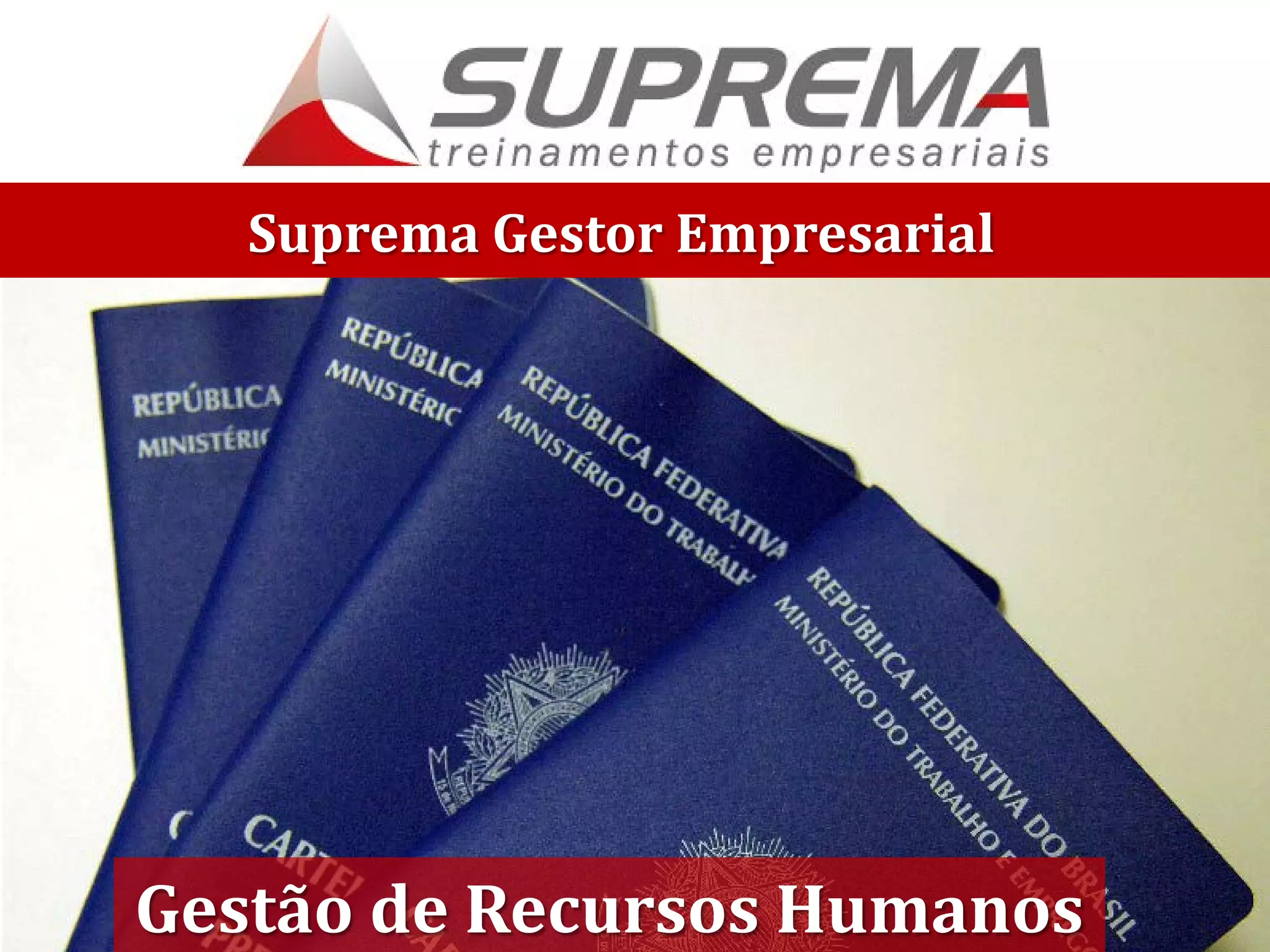 O documento descreve um módulo de Gestão de Recursos Humanos do curso Suprema Gestor Empresarial. O módulo tem o objetivo de capacitar alunos para atuarem no departamento de recursos humanos das empresas de forma preventiva e visando o negócio. Detalha os conteúdos, mercado de trabalho, características necessárias e informações de contato do curso.