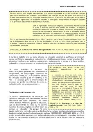 O documento discute a gestão democrática na educação brasileira. Aborda a legislação que estabeleceu a gestão democrática como princípio constitucional e as formas de implementá-la nas escolas por meio da participação da comunidade escolar e processos colegiados de tomada de decisão. Também analisa as modalidades de escolha de diretores escolares e como isso influencia no processo de democratização da gestão.