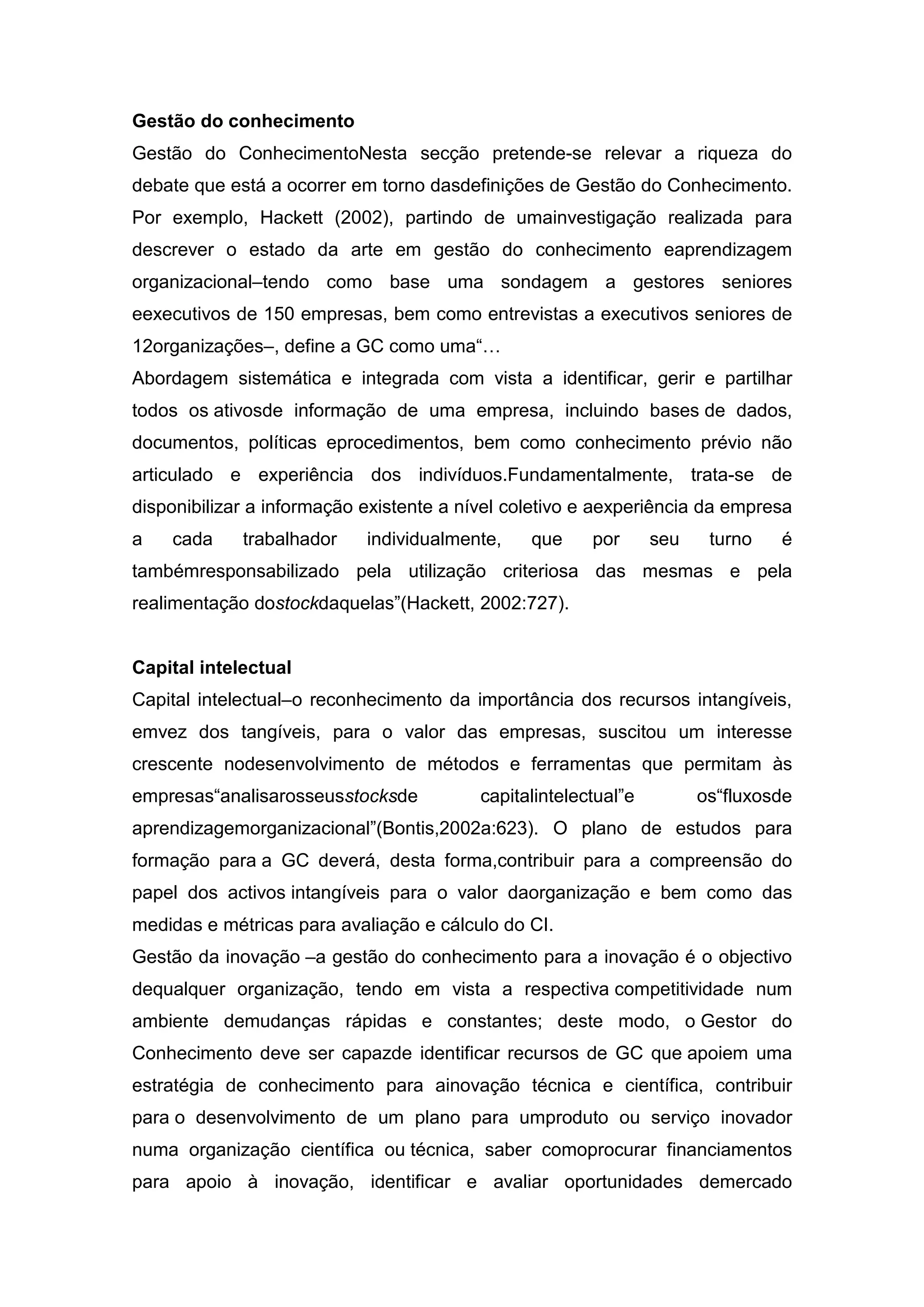 O documento discute a gestão do conhecimento, capital intelectual, aprendizagem organizacional e competências organizacionais. Ele define gestão do conhecimento como identificar, gerir e compartilhar ativos de informação e experiência. Também discute a importância do capital intelectual e dos recursos intangíveis para o valor das empresas e como medir ativos intangíveis.