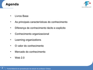 O documento resume os principais conceitos sobre gestão do conhecimento, incluindo as características do conhecimento tácito e explícito, organizações aprendentes, o valor do conhecimento, mercado do conhecimento e Web 2.0. Apresenta também biografias de autores relacionados ao tema como Nonaka, Takeuchi e Chiavenato.