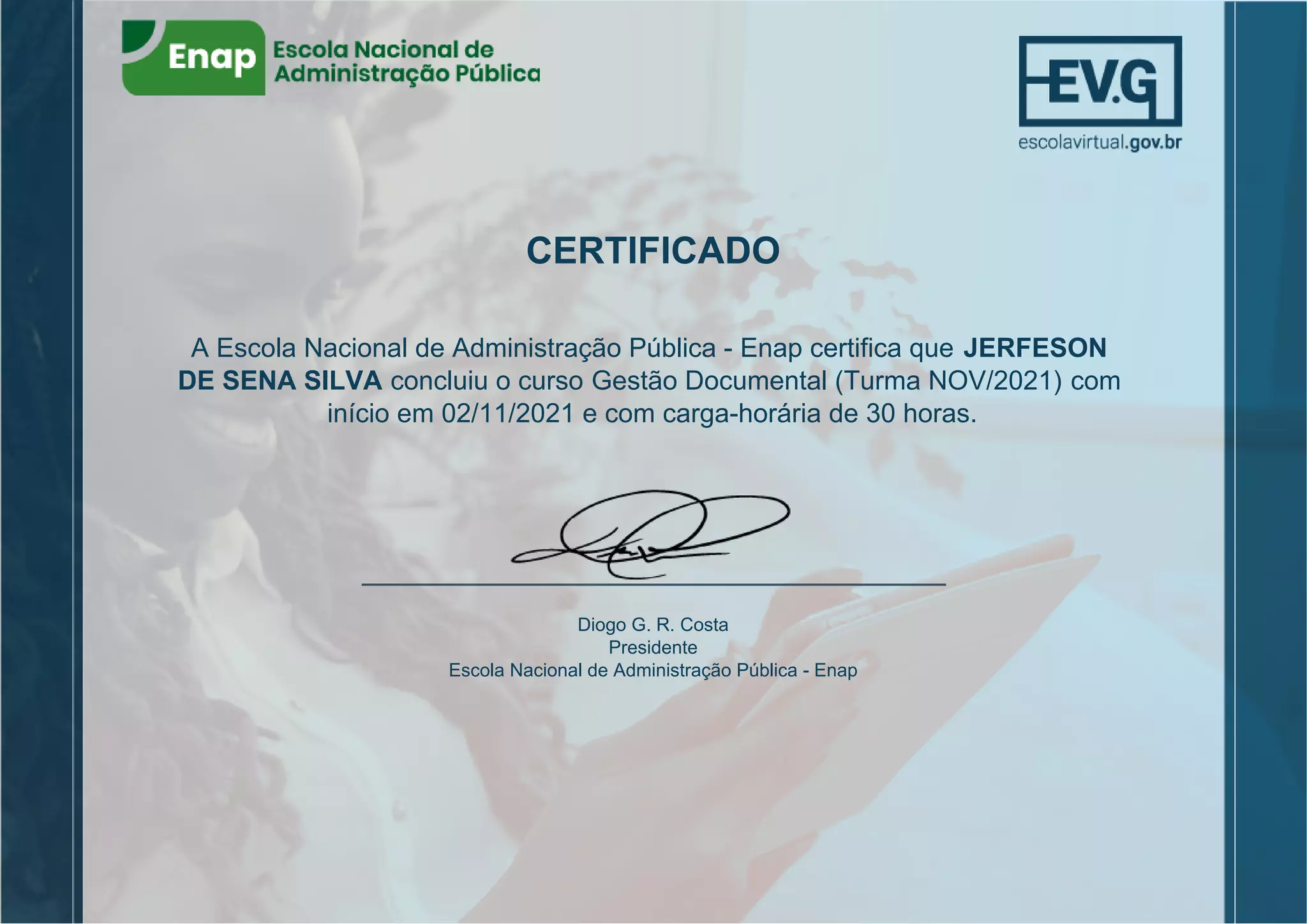 O certificado da Escola Nacional de Administração Pública (ENAP) comprova que Jerfeson de Sena Silva concluiu o curso de Gestão Documental com 30 horas de carga horária e nota final de 75,83. O curso abordou conceitos, legislação e instrumentos de gestão documental no TCU. O certificado pode ser validado através de QR code ou código disponível no site da escola virtual.