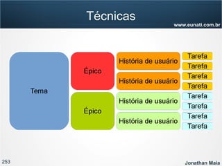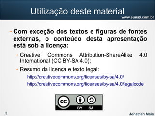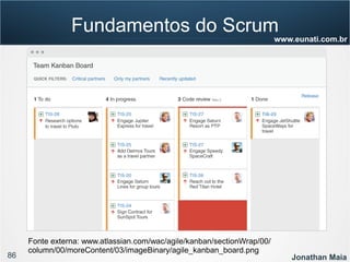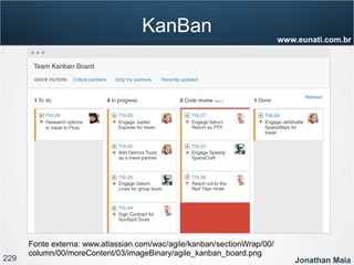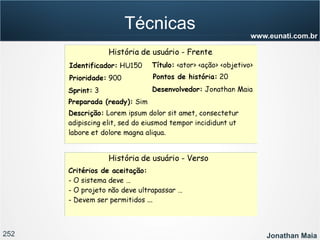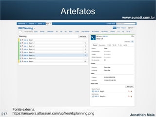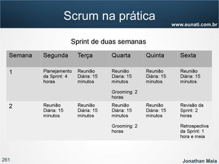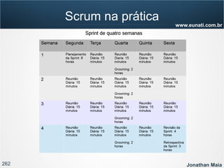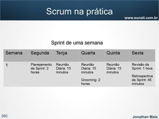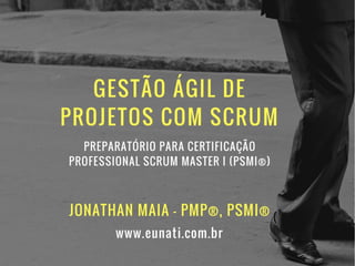 O documento apresenta informações sobre Jonathan Maia, um profissional que atua com gerenciamento de projetos ágeis. As informações incluem seu currículo, certificações, experiência e contatos. O documento também fornece um sumário dos tópicos a serem abordados em uma apresentação sobre gestão ágil e Scrum.