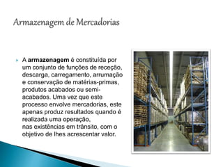 O documento discute os processos e importância da armazenagem. A armazenagem envolve receber, descarregar, carregar e armazenar matérias-primas, produtos e semi-acabados. Uma armazenagem eficiente requer que os itens estejam disponíveis na quantidade, qualidade e momento necessários ao menor preço possível. Há diferentes tipos e prioridades de armazenagem dependendo dos fatores envolvidos.