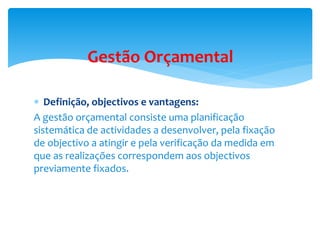 O documento discute os conceitos de gestão orçamental, incluindo as fases de gestão orçamental, vantagens da gestão orçamental, orçamento de vendas, orçamento de compras e orçamento de estoques. O objetivo da gestão de estoques é determinar quanto e quando encomendar itens de estoque e manter níveis adequados para atender aos clientes.