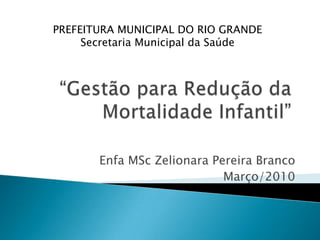 Este documento discute estratégias para reduzir a mortalidade infantil em uma cidade no Rio Grande do Sul, Brasil. Ele identifica fatores que contribuem para a mortalidade infantil, como a falta de uma rede integrada de atenção materna e infantil. O documento também analisa os índices de mortalidade infantil e natalidade entre 2003-2009. Ele propõe ações como mapear a rede de atenção, monitorar indicadores e integrar protocolos de atenção para reduzir a taxa de mortalidade.