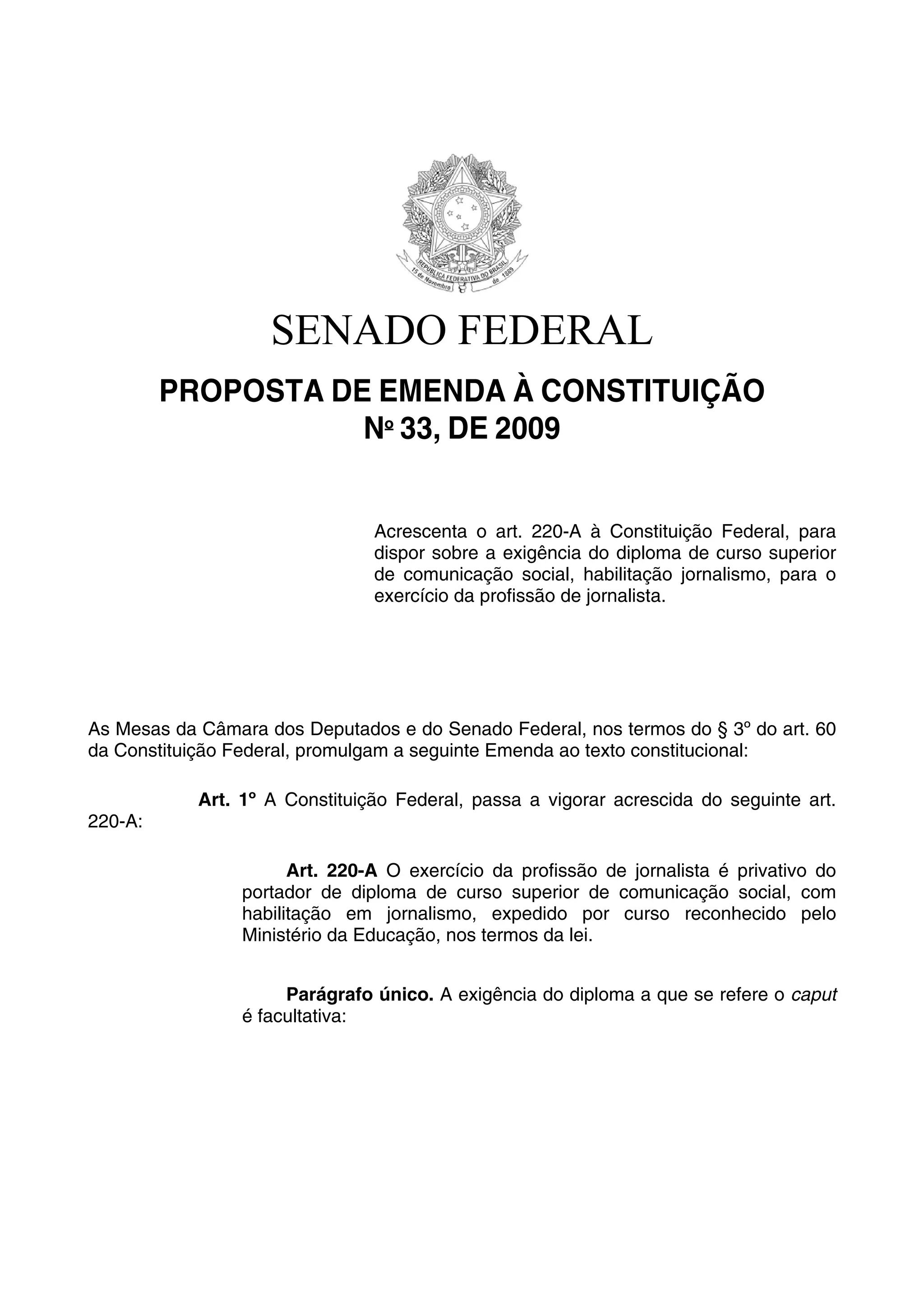 Este documento propõe uma emenda constitucional para exigir diploma universitário em jornalismo para o exercício da profissão de jornalista. A justificativa alega que o jornalismo requer conhecimentos técnicos e éticos adquiridos na universidade e que a desregulamentação levaria à desqualificação da profissão.