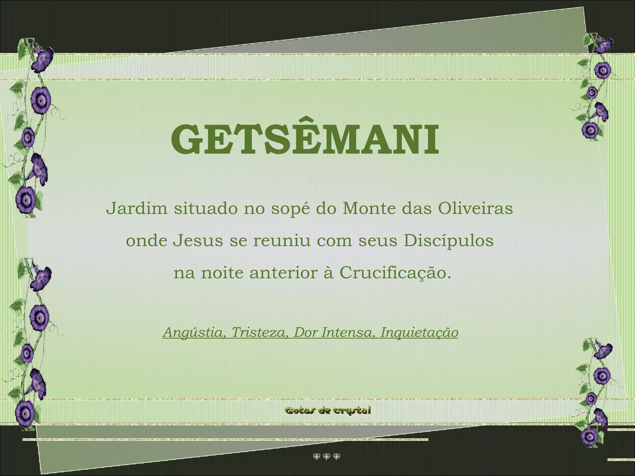 O documento descreve o Jardim de Getsêmani, onde Jesus orou na noite anterior à crucificação. Ele experimentou grande angústia e tristeza, suando sangue sob forte estresse. O texto fornece lições para lidar com a angústia, como orar, pedir ajuda aos amigos e enfrentar os problemas.