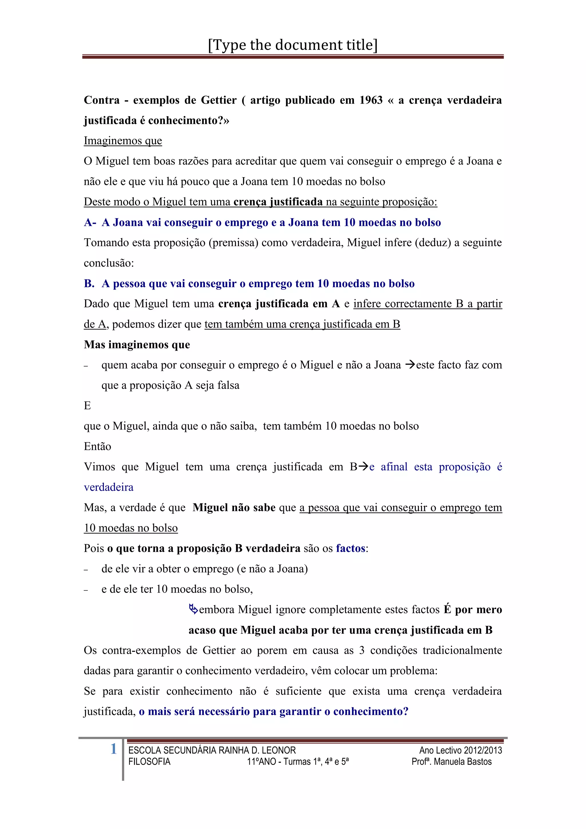 Este documento discute os contra-exemplos de Gettier à teoria tradicional do conhecimento como crença verdadeira justificada. Ele apresenta um exemplo em que alguém tem uma crença justificada que se mostra verdadeira por acaso, sem realmente saber a verdade. Isso coloca em questão se a crença justificada é suficiente para o conhecimento. O documento também argumenta que exigir certeza absoluta para a justificação é insatisfatório, pois quase nenhuma de nossas crenças seria justificada.