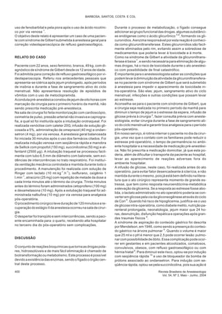 O documento descreve o caso de uma paciente de 22 anos com Síndrome de Gilbert submetida a uma cirurgia videolaparoscópica sob anestesia geral. A paciente apresentou boa recuperação pós-operatória sem sinais de toxicidade, graças à escolha cuidadosa de drogas anestésicas e à prevenção de fatores de estresse pré-operatórios que poderiam reduzir a atividade da enzima hepática responsável pelo metabolismo de medicamentos.