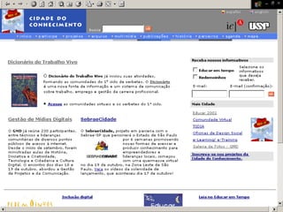 O documento descreve os programas e projetos da Cidade do Conhecimento da USP, incluindo programas de educação para professores, um dicionário online sobre trabalho e carreiras, gestão de mídias digitais, e parcerias com outras organizações para fortalecer empreendedorismo e participação cívica.