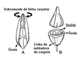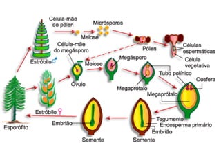 O documento resume as principais características das gimnospermas e angiospermas. As gimnospermas foram as primeiras a ter sementes visíveis (pinhas) e reprodução independente da água. Incluem coníferas como pinheiros. Angiospermas surgiram depois com flores e frutos, dominando a partir do Cretáceo, dividindo-se em monocotiledôneas e dicotiledôneas.