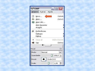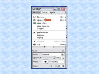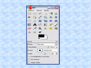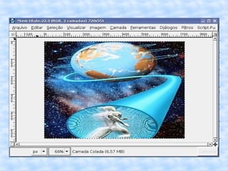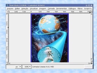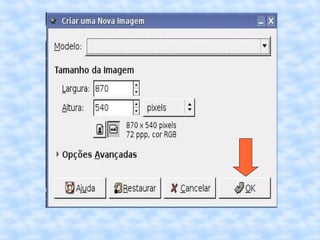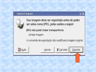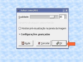 O documento fornece instruções passo a passo para editar uma imagem no GIMP, incluindo cortar, redimensionar, adicionar uma borda vintage e salvar a imagem editada com um novo nome.