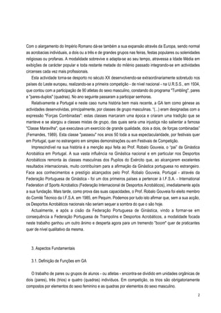 O documento descreve a ginástica acrobática, incluindo sua história, estrutura, elementos e importância no ambiente escolar. A modalidade surgiu na antiguidade e evoluiu para uma atividade competitiva no século XX. Os exercícios são compostos por elementos individuais e de equilíbrio realizados em pares ou grupos, requerendo pegas e segurança. A ginástica acrobática permite diferentes níveis de aprendizagem para os alunos.