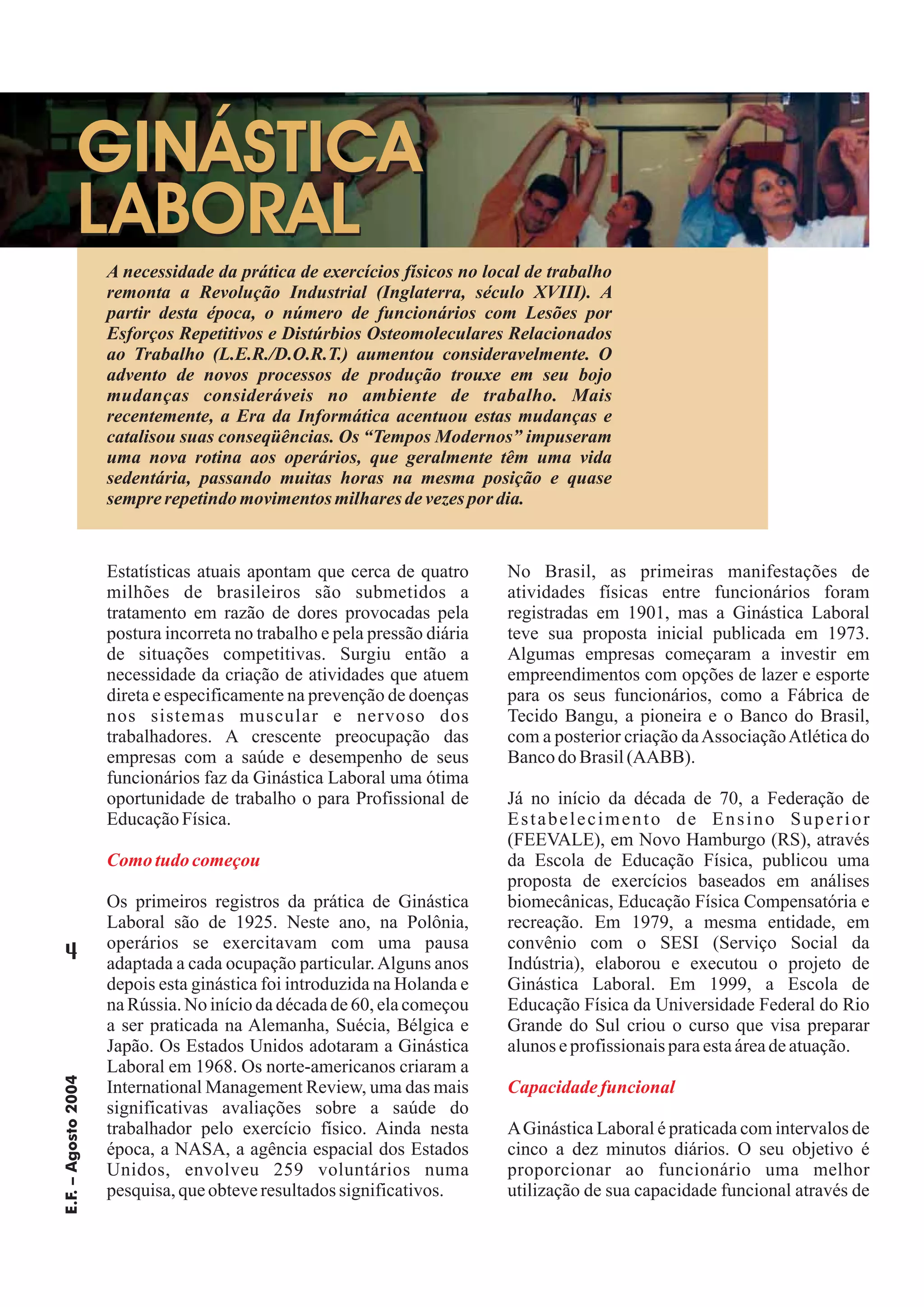 O documento discute a ginástica laboral, sua história e benefícios. A ginástica laboral surgiu na Revolução Industrial para combater problemas musculoesqueléticos causados por trabalho repetitivo. Hoje, programas de ginástica laboral ajudam a prevenir lesões, melhorar a saúde e produtividade dos funcionários. A ginástica laboral deve ser planejada e aplicada por profissionais de educação física habilitados.